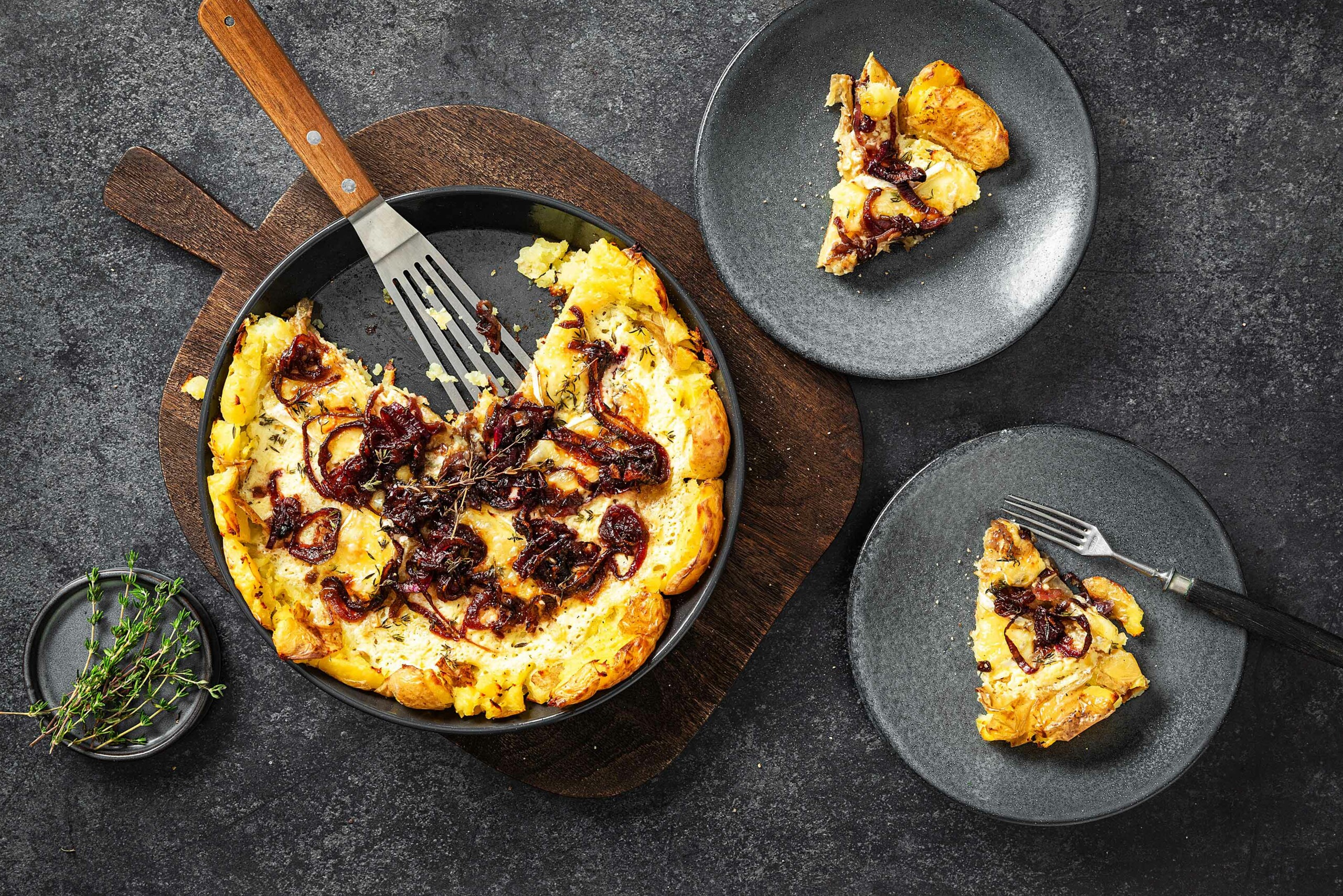 Dans cette recette, les pommes de terre écrasées font office de pâte. Ajouter ensuite une couche de crème fraîche, du fromage fondu, des oignons caramélisés et du thym frais. Et voilà un plat réconfortant pour passer d’agréables journées d’automne.